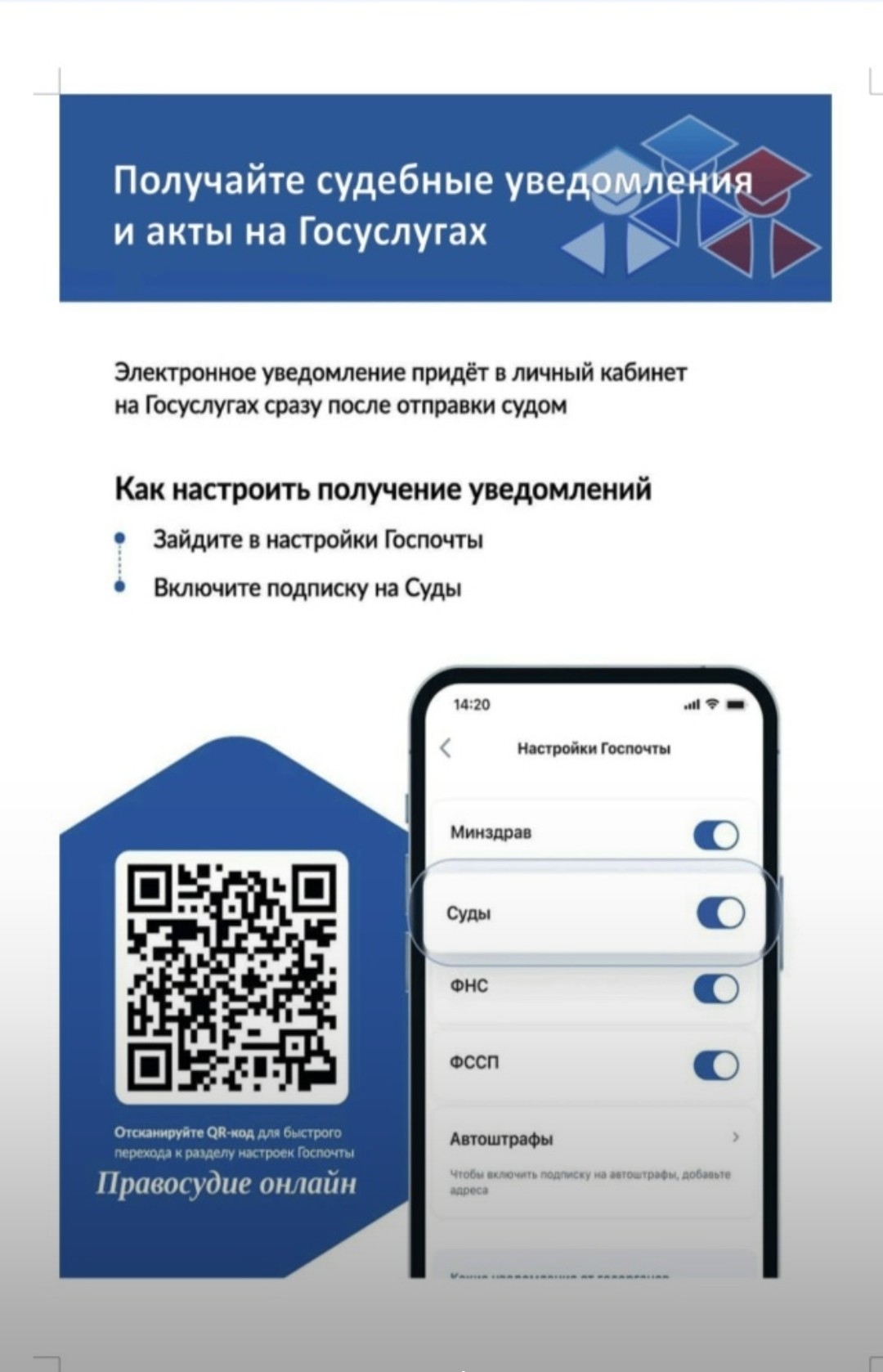 ГЭПС - государственная электронная почтовая система, которая является подсистемой Единого портала государственных и муниципальных услуг. ГЭПС позволяет в кратчайшие сроки получать письма в электронном виде от государственных органов и учреждений. Суды Российской Федерации в своей деятельности используют возможности ГЭПС для направления судебных уведомлений, включая подготовку и отправку судебных извещений, копий судебных актов в электронном виде. Более того, на сегодняшний день отправление судебных извещений и судебных актов посредством ГЭПС является приоритетным по отношению к другим способам отправки корреспонденции. В чем же преимущество получения судебных писем посредством ГЭПС? Прежде всего, это: - моментальное пуш-оповещение и письмо на электронную почту. Своевременная информированность о судебном заседании, о принятом решении суда дает возможность в полной мере реализовать свое конституционное право на судебную защиту. - письма не теряются, они всегда доступны в электронной форме; - отсутствует необходимость получения писем в отделениях Почты России; - при смене места жительства и временном отсутствии по месту проживания, письмо будет вами получено, где бы вы ни находились; - при таком способе получения корреспонденции соблюдается конфиденциальность, которая обеспечивается через меры безопасности, помогающие защитить вашу учетную запись. Судебное уведомление, направляемое с использованием ГЭПС, формируется в виде текстового сообщения, к которому могут быть приложены один или несколько файлов в формате PDF (судебная повестка, копия постановления, решения суда и т.д.), подписанных усиленной квалифицированной электронной подписью судьи, уполномоченного работника аппарата суда. Доставка судебного уведомления осуществляется в личный кабинет физического лица, индивидуального предпринимателя, юридического лица на едином портале Госуслуг исключительно при наличии согласия адресата на получение судебных уведомлений. Поэтому важно в своем профиле на сайте или в приложении Госуслуг настроить получение уведомлений от Госпочты. Для этого необходимо войти в раздел «Настройки Госпочты» и включить подписку на «Суды». Полный доступ ко всем сервисам портала Госуслуг, в том числе доступ к ГЭПС имеют только пользователи с подтвержденной учетной записью. Получить подтвержденную учетную запись можно несколькими способами, в том числе обратившись в МФЦ. Использование цифровых технологий охватывает всё больше сфер жизни человека, побуждая нас шагать в ногу со временем. Цифровизация судебной деятельности направлена на сокращение времени, необходимого для реализации права на судебную защиту, улучшение доступности судебной защиты, снижение затрат на ее осуществление.
